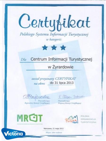 Żyrardowskiemu Centrum Informacji Turystycznej został przyznany Certyfikat Polskiego Systemu Informacji Turystycznej w kategorii 3 gwiazdki (w 4 stopniowej kategorii) na okres do 31 lipca 2013 r. Pozytywne zakończenie ścieżki certyfikacyjnej równoznaczne jest z włączeniem danego punktu informacji turystycznej do sieci Polskiego Systemu Informacji Turystycznej. Więcej o tym Weronika Lipka.