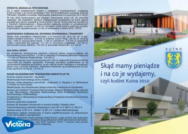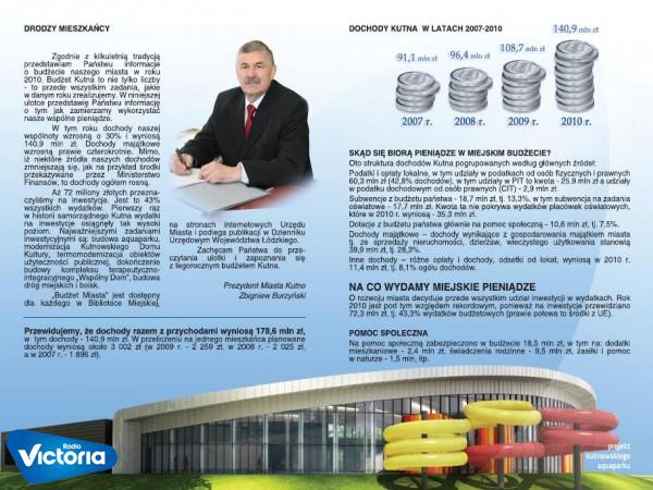 Na stronie Urzędu Miasta Kutno zamieszczono ulotkę pod tytułem ,,Skąd mamy i na co wydajemy miejskie pieniądze''.Ulotka mówiąc wprost jest skróconą wesją budżetu miasta.Tego typu publikacje wydawane są przez samorządy w całej Polsce.Generalnie chodzi o to, aby wszelkie działania władz w zakresie administrowania miastem były po prostu przejrzyste.Mówi Bożena Śniadała-Pasikowska Skarbnik UM Kutno.