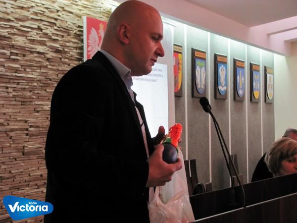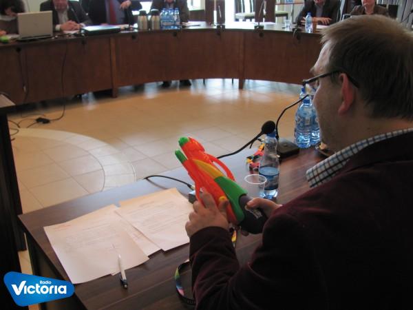 Opozycja ma większość i do porządku obrad wprowadza punkty odpowiadające radnym z tej grupy, komentuje radny PSL Michał Śliwiński. Radny dla Przewodniczącego Rady Powiatu i Przewodniczącego Komisji Rewizyjnej przygotował nietypowy, choć jak sam powiedział, pasujący do sytuacji prezent. Obaj Panowie otrzymali zabawkowe pistolety na wodę: