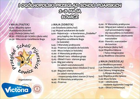 Zjazd rozpoczyna się w piątek, 1 maja o godz. 16 Eucharystią w kościele ojców Pijarów a o godzinie 18.30 rozpocznie się główna część przeglądu, z występami poszczególnych scholi.