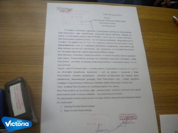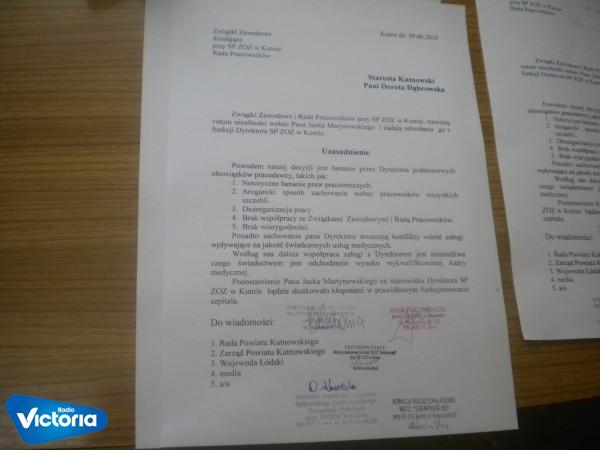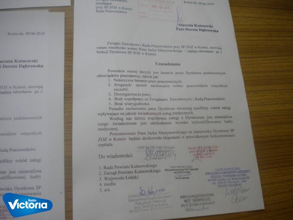 W ciągu najbliższych dni zarząd powiatu kutnowskiego musi podjąć decyzję odnośnie przyszłości dyrektora szpitala Jacka Marynowskiego.Wczoraj votum nieufności wobec dyrektora wyraziły związki zawodowe oraz Rada Pracowników SPZOZ.Zdaniem Barbary Mordzak przewodniczącej NSZZ Solidarność w kutnowskim szpitalu, dyrektor łamie prawo i nie da się z nim dalej współpracować.
