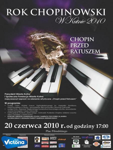 Rok 2010 - Rokiem Chopinowskim.Z tej okazji w całym kraju organizowane sa koncerty przypominające twórczość mistrza.W Kutnie już w najbliższą niedzielę niezwykłe wydarzenie artystyczne - ,,Chopin przed Ratuszem''.Szczegółowy program na plakacie poniżej.Patronat medialny nad imprezą objęło Radio Victoria.